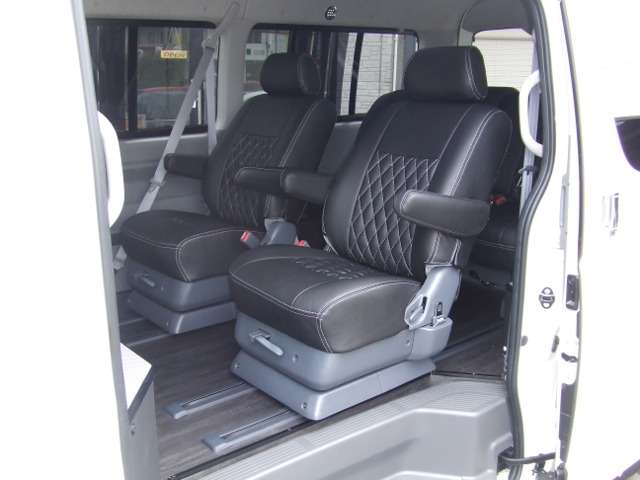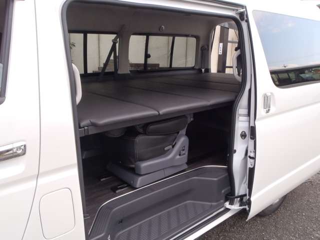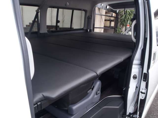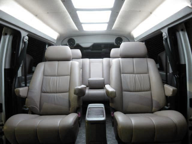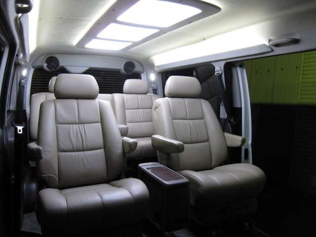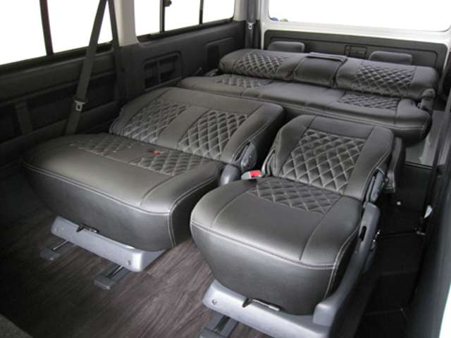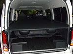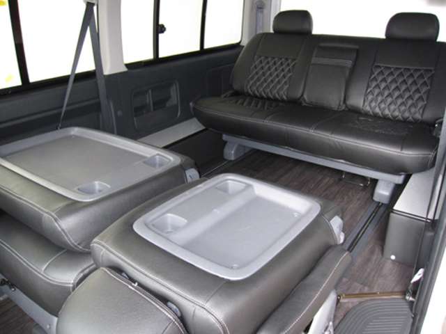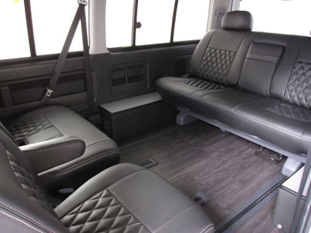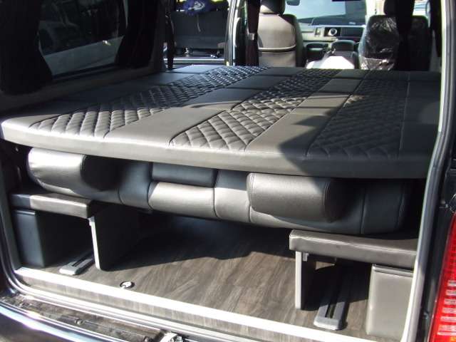 | 標準装備 | ・ロングスライドレール埋め込み3列シート仕様 ・遮音シート入り3層床張り ・床収納ボックス ・シンク、コンロ、テーブル付 ・オリジナルベッド ・全席シートカバー付 |