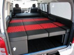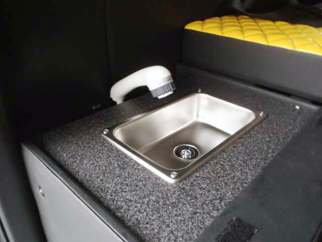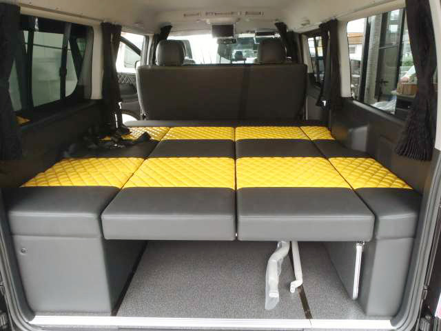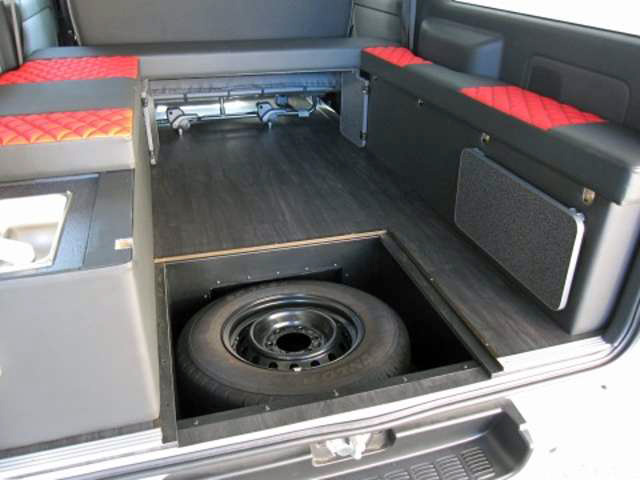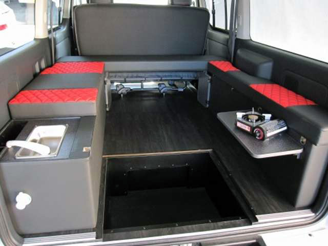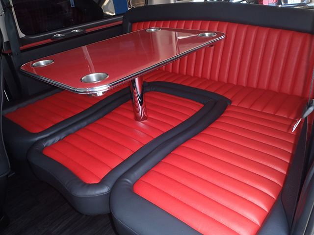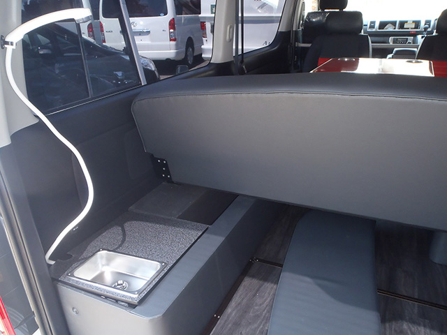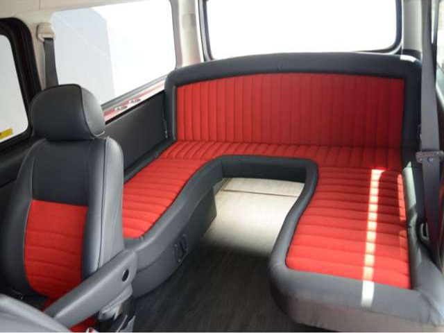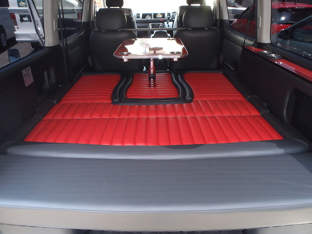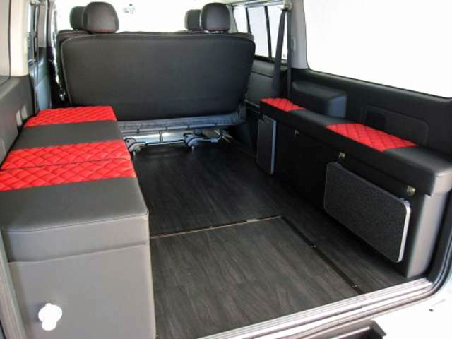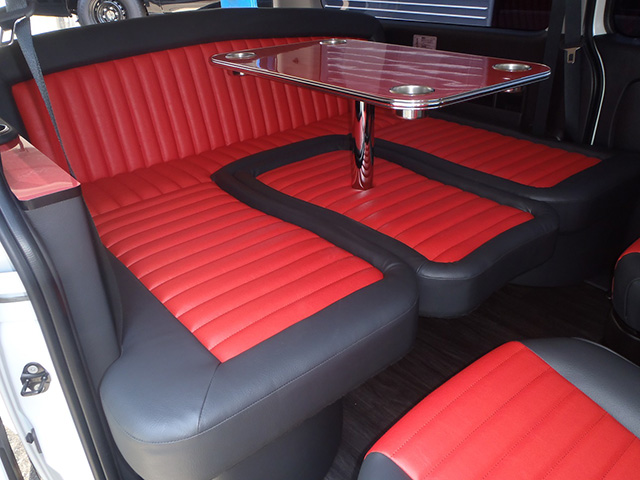 | 標準装備 | ・遮音シート入り3層床張 ・床収納BOX ・シンク、コンロ、テーブル付 ・オリジナルプレミアムベッド ・全席シートカバー付 ・各種テーブル |